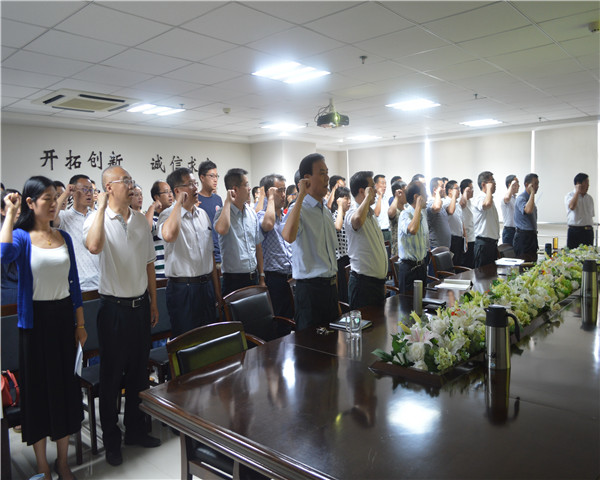 會議進(jìn)行第一項,全體人員起立,唱國歌。嘹亮高昂的義勇軍進(jìn)行曲響徹整個會議室、整個集團(tuán)公司,歌聲振奮同志們的意志,更加堅定了對黨的信仰。