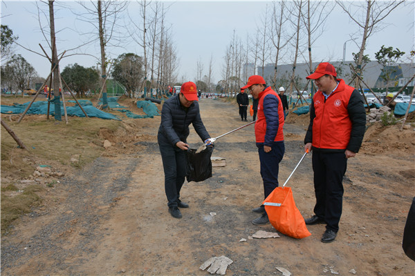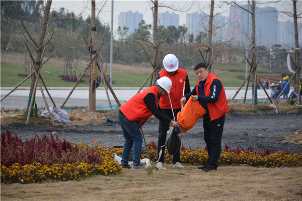 上午十時三十分,志愿服務活動開始后,集團公司黨委委員、副總經理、項目部總經理汪洋親自帶頭參加活動,其他黨員干部帶頭干,職工群眾積極干,參建單位負責人志愿加入干,大家拿起工具、彎下腰去,撿起草地上的生活垃圾,集中放進現(xiàn)場放置的垃圾桶內;沒有拿到工具的同志們也拿起簡易垃圾袋,將撿到的生活垃圾放進垃圾袋盛滿后再放進垃圾桶內。一時間,黨徽熠熠、愛心閃閃、干勁滿滿,不到一個小時時間,約20人的志愿服務隊伍完成了近20000平米區(qū)域的垃圾清理任務,景觀施工現(xiàn)場面貌大為改觀。