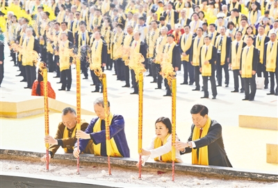 當(dāng)日上午,黃帝故里園區(qū)旗幡獵獵、莊嚴(yán)肅穆。南門廣場上,龍騰虎躍,鼓聲震天。寓意著中華兒女來自五湖四海的540名炎黃子孫,分別組成各90人的文化方陣、岐黃方陣、企業(yè)方陣、同拜方陣、臺胞方陣、僑胞方陣六大拜祖隊伍,整肅衣冠,佩戴黃帝絲巾,進(jìn)尋根門、經(jīng)系祖壇、上軒轅橋、過故里祠,觀甲骨碑林方柱高舉,感杜嶺方鼎王者風(fēng)范,聽青銅編鐘古音繚繞,最后緩步來到拜祖廣場,端詳兩側(cè)連廊浮雕,感觸中華文明五千多年的源遠(yuǎn)流長。