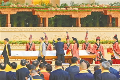 凈手上香。郝龍斌,全國人大代表、中國和平統(tǒng)一促進(jìn)會香港總會常務(wù)副會長凌友詩,英國荷柏穎中藥公司總裁、第一位擔(dān)任英國市政廳閣員高職的華裔官員王臺生,泰國中華總商會主席林楚欽,緬甸中華總商會榮譽會長楊釧玉,華為集團(tuán)高級副總裁楊瑞凱,深圳國際控股有限公司董事會主席李海濤,優(yōu)必選科技股份有限公司董事會主席、執(zhí)行董事兼行政總裁周劍,全國人大代表、全國勞模、好想你健康食品股份有限公司董事長石聚彬走到臺前,凈手上香。