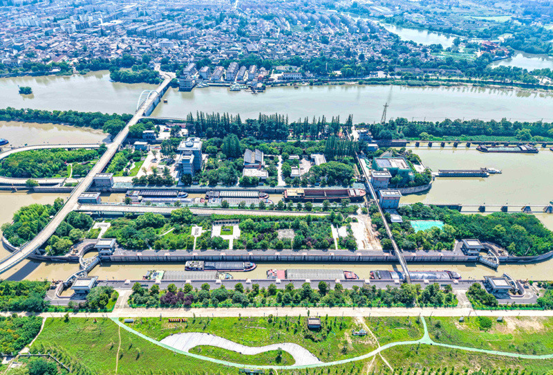 2025年7月4日,船舶有序通過(guò)京杭大運(yùn)河揚(yáng)州段邵伯船閘(無(wú)人機(jī)照片)。新華社發(fā)(任飛 攝)