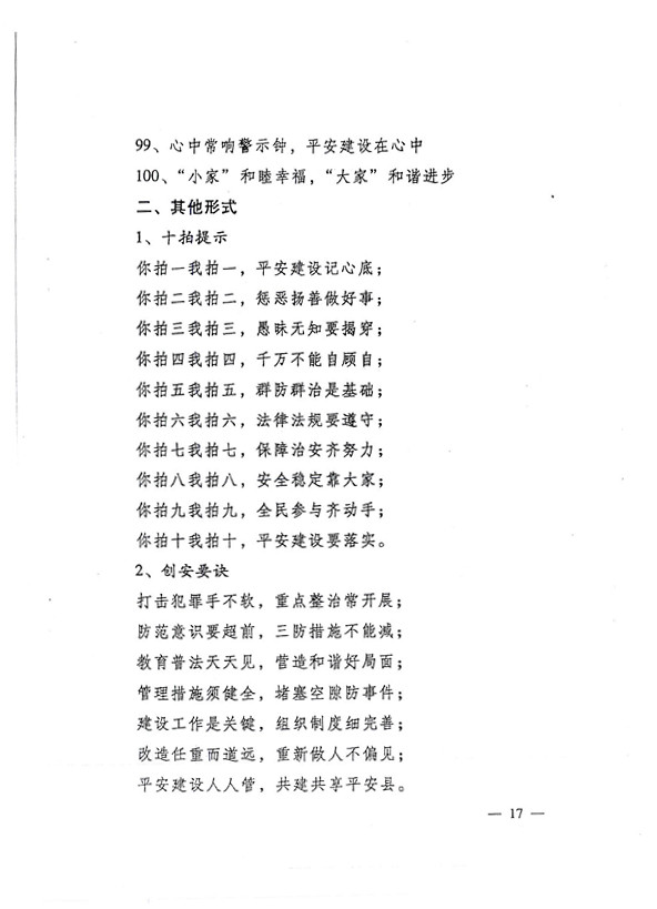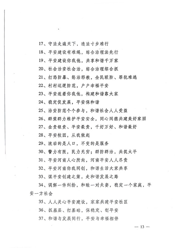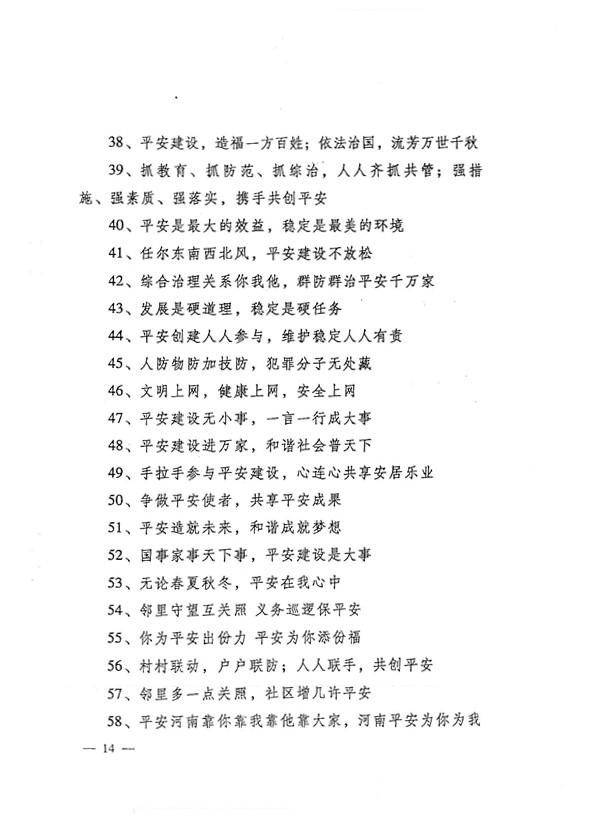 平安兩字重千斤,社會穩(wěn)定得民心。 創(chuàng)建平安人人有責(zé),構(gòu)建和諧人人參與。