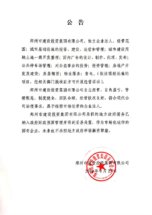 鄭州市建設(shè)投資集團有限公司不承擔地方政府舉債融資職能的公告